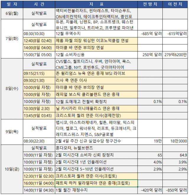 이 밖에 8일에는 6명의 연준 인사들이 발언에 나섭니다. △존 윌리엄스 뉴욕 연방은행(연은) 총재가 WSJ와 인터뷰를 진행하고 △리사 쿡 연준 이사 △마이클 바 연준 부의장 △래피얼 보스틱 클리블랜드 연은 총재 △닐 카시카리 미니애폴리스 연은 총재 △크리스토퍼 월러 연준 이사 등이 현재 인플레이션과 고용, 시장의 반응에 대한 본인들의 생각을 이야기할 기회를 갖습니다.