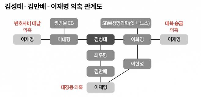 개별 사건 또는 의혹을 하나씩 따로 떼어 보면 정치인과 기업가 관계에 물음표가 많다. 이재명 대표와 김성태 전 회장 사이 ‘직접적인’ 인연은 그동안 드러나지 않았다. 당사자들도 서로를 알지 못한다고 주장한다. 그러나 김성태 전 회장이 사업을 키워온 과정과 자금 흐름, 인맥들은 이재명 대표와 관련된 각종 의혹의 줄기를 이루고 가지로 뻗어 나와 있다. 검찰은 김성태 전 회장의 인맥과 돈 일부의 종착지가 이재명 대표라고 의심한다.