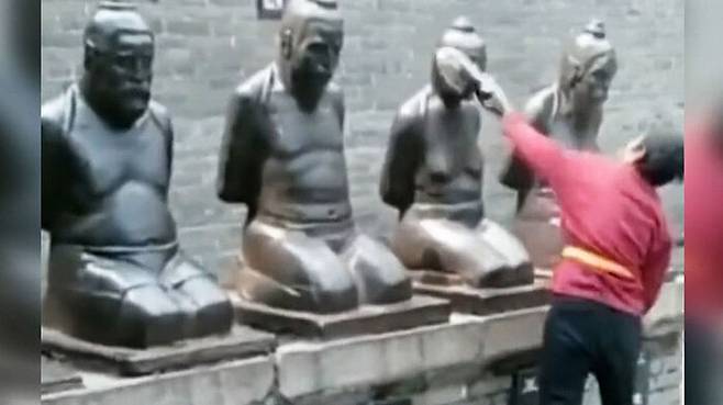 영화를 본 관객들이 악비의 시를 읊고, 악비를 살해한 조정 대신들의 동상을 상대로 화풀이에 나선 겁니다.