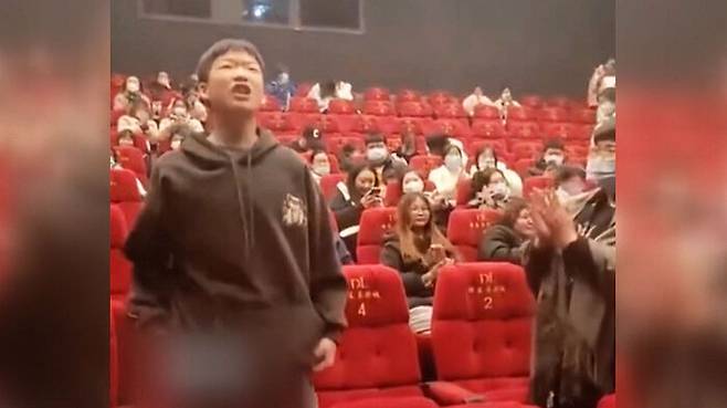 중국의 영화관, 영화가 끝났는데도 관객이 자리를 뜨지 않고 큰소리로 시를 읊습니다.