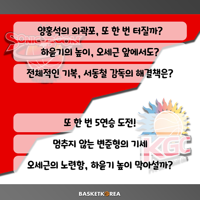 KGC는 5연승에 도전한다. 변준형의 기세가 기대되고, 오세근의 노련함이 하윤기의 높이를 막을 수 있을지 지켜봐야 한다.