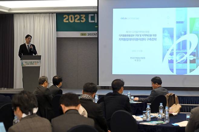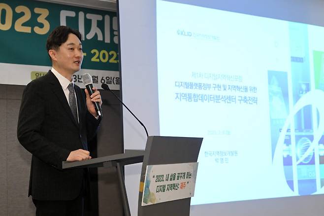 한국IT서비스학회·제주특별자치도·제주연구원이 주최하고 디지털플랫폼정부위원회, 전자신문 등이 후원하는 '제1차 디지털지역혁신포럼'이 6일 제주시 메종글래드제주 호텔에서 열렸다. 박영민 한국지역정보개발원 디지털전략기획부장이 '지역특화 데이터분석센터 운영전략'을 주제로 발표하고 있다.