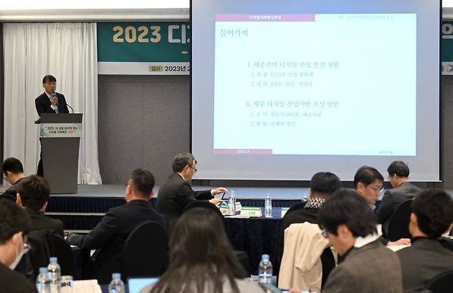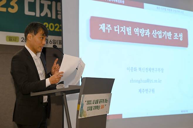 한국IT서비스학회·제주특별자치도·제주연구원이 주최하고 디지털플랫폼정부위원회, 전자신문 등이 후원하는 '제1차 디지털지역혁신포럼'이 6일 제주시 메종글래드제주 호텔에서 열렸다. 이중화 제주연구원 혁신경제연구부장이 '지역의 디지털 역량과 산업기반 조성'을 주제로 발표하고 있다.