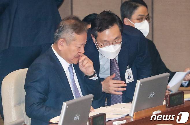(서울=뉴스1) 허경 기자 = 이상민 행정안전부 장관이 6일 서울 여의도 국회에서 열린 정치·외교·통일·안보 분야 대정부질문에서 직원과 대화하고 있다. 이날 더불어민주당은 이태원 핼러윈 참사의 책임을 물어 이상민 행정안전부 장관에 대한 탄핵소추안을 당론으로 발의하기로 했다. 2022.2.6/뉴스1