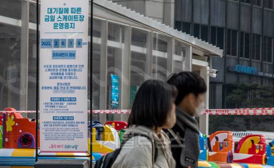 서울 등 수도권과 세종에서 고농도 미세먼지 비상저감조치가 시행된 6일 서울광장 스케이트장에 운영 중단 안내문이 세워져 있다.