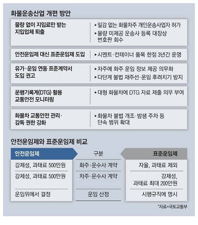 지난해 화물연대 집단 운송 거부 사태를 불러온 안전운임제를 대신해 화주와 운송 업체 간 계약에서 최소 운송료 보장을 강제하지 않는 표준운임제를 도입한다. 기존 안전운임제가 화주의 운임계약까지 규율하면서 갈등을 유발했던 점을 고려해 화주와 운송사의 계약은 강제성 없는 '가이드라인' 형태로 관리한다는 구상이다. 또 화주의 운임 지급 의무와 처벌을 삭제한다.