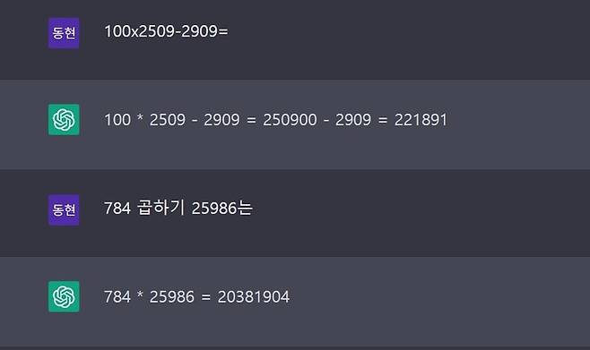 실제로 기자가 초등학생 수준의 곱셈 문제를 챗GPT에게 물어봤는데, 모두 오답을 내놨다.