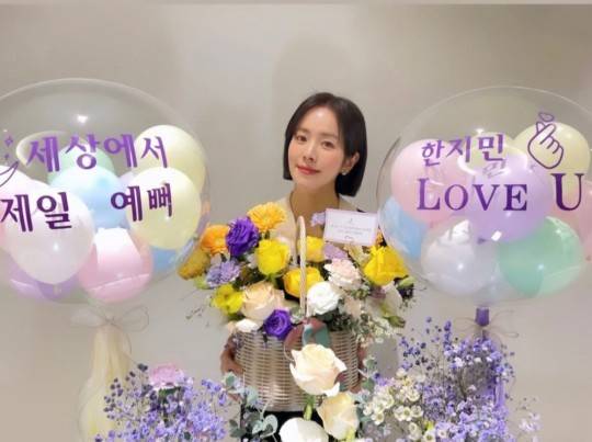 공개된 사진에서 한지민은 두 손으로 들기에도 버거워보이는 꽃바구니를 품에 안고 미소짓고 있다. 단발병 부르는 단발 여신 자태로 '세젤예' 미모를 뽐냈다.