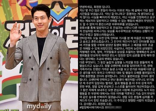 그 동안 저에게 보내주신 오랜 관심과 사랑에 조금이라도 누가 되는 행동을 한 부분에 대해서는 이유 여하를 막론하고 가슴 깊이 반성하며 같은 실수를 반복하지 않겠습니다. 정말 모든 분들께 심려를 끼쳐드려 다시 한번 죄송합니다. 더 주의깊고 현명한 사람이 되겠습니다. 감사합니다. 최정원 드림.