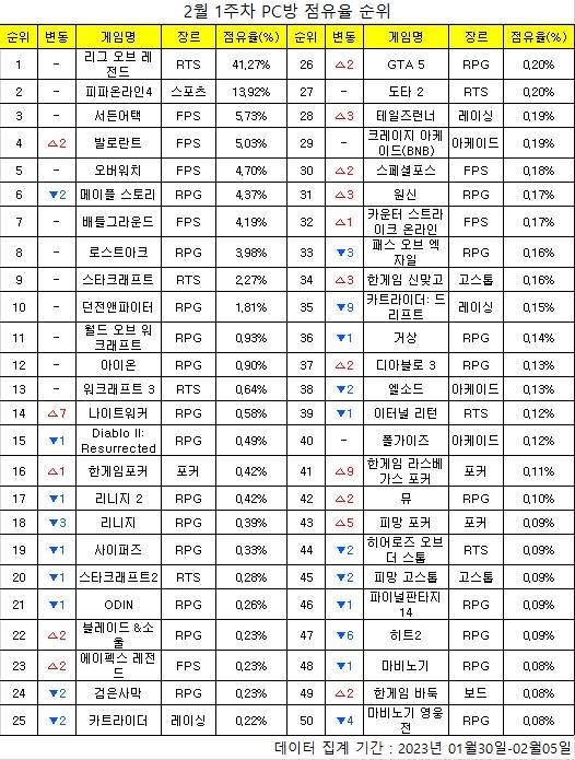한 주간의 PC방 순위를 되짚어 보고, 어떤 변화가 있었는지 알아보는 'PC방순위' 코너입니다. 데일리게임은 매주 PC방 순위를 일목요연하게 정리, 독자들이 알아보기 쉽도록 제공합니다. 지난 한 주간 어떤 PC 온라인게임들이 눈길을 끌었는지 살펴봤습니다. < 편집자주 >