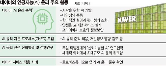 네이버는 'AI 윤리 준칙' 마련 등 관련 선행연구와 서비스 적용에 속도를 높였다. 지난 2021년 2월 서울대 AI 정책이니셔티브(SAPI)와 협업해 'AI 윤리 준칙'을 발표한 이후, 자체 서비스에 적용을 추진중이다.