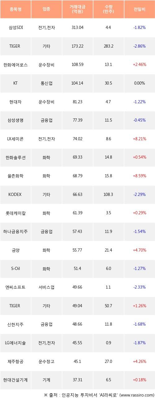 외국인 투자자의 순매수 상위 20개 종목은 삼성SDI, TIGER 차이나항셍테크, 한화에어로스페이스, KT, 현대차, 삼성생명, LX세미콘, 한화솔루션, 율촌화학, KODEX 차이나항셍테크등이다.