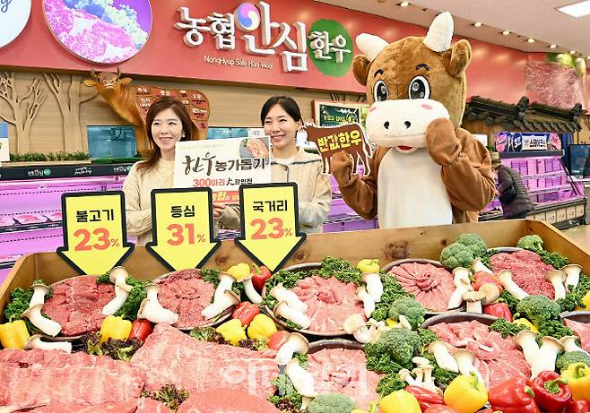 [이데일리 김태형] 6일 서울 서초구 농협유통 하나로마트 양재점에서 모델들이 '한우 300마리 물량! 大 할인전'을 소개하고 있다.