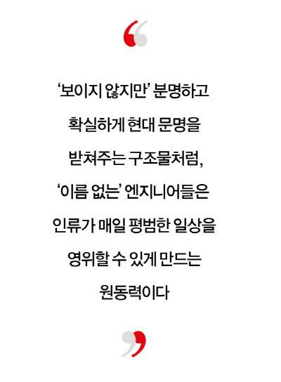 건설 엔지니어는 눈에 띄는 직업이 아니다. 유명 건축가처럼 자신의 이름을 브랜드로 내걸거나 개개인이 주목을 받지도 않는다. 하지만 즐비한 아파트 단지, 수만명이 이용하는 지하철 역사, 초대형 해상풍력 발전기, 야심찬 수백조원짜리 프로젝트까지, 건설 엔지니어들이 만들어내는 거대 구조물들은 세계를 단단하게 지탱하고 있다.