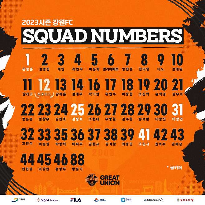 프로축구 K리그1 강원FC가 2023시즌을 앞두고 선수단 등번호를 공개했다.