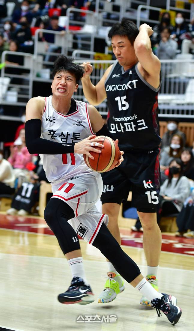 KGC 양희종이 6일 수원KT아레나에서 열린 2022-2023프로농구 수원KT와 안양KGC의 경기에서 김동욱을 따돌리며 골밑으로 향하고 있다. 2023.2.6.