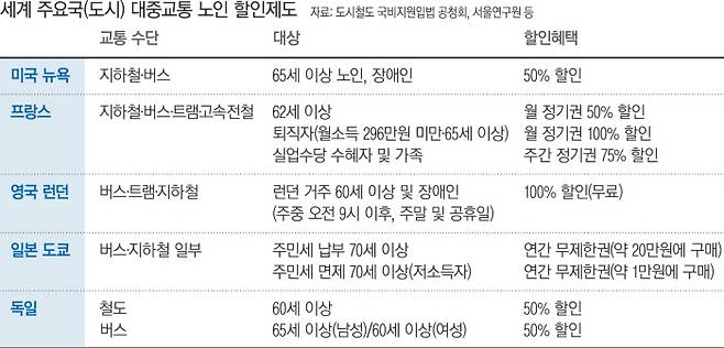 프랑스는 62세 이상 노인에게 지하철·버스 등 모든 대중교통의 월 정기권을 50% 할인해준다. 단, 월소득 296만원 미만의 65세 이상 퇴직자, 장애인·재향군인에게는 월 정기권을 무료로 제공한다. 영국 런던에서는 60세 이상이면 버스·트램·지하철 탑승이 무료다. 다만 주중에는 출근시간이 지난 오전 9시 이후부터 무임승차가 가능하다.