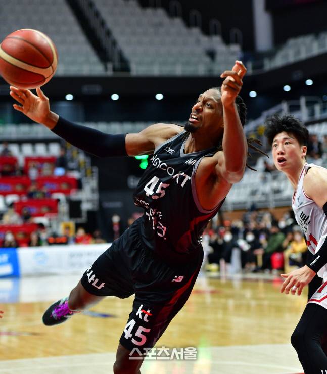 KT 존스가 6일 수원KT아레나에서 열린 2022-2023프로농구 수원KT와 안양KGC의 경기에서 4쿼터 막판 터치아웃되는 볼을 잡기위해 안간힘을 쓰고 있다. 2023.2.6.