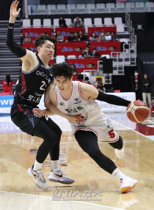 KGC 변준형이 KT 수비를 피해 골밑을 파고 들고있다.