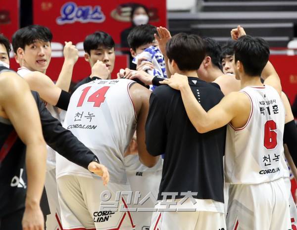 KGC가 87-84로 승리했다. 경기종료후 스펠맨이 동료들로부터 축하 받고있다.
