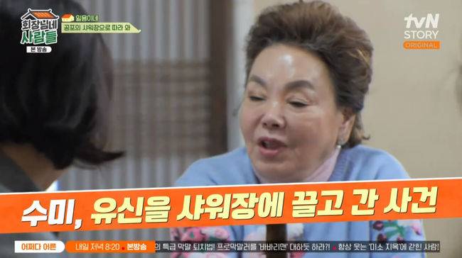 엄유신은 "언니와 내가 추억이 있다"라며 "샤워장 생각나나. 언니한테 처음 샤워장에 끌려간 적이 있다"라고 말했다. 이에 김수미는 "샤워장이 무서운 곳이었다"라고 말해 눈길을 끌었다.