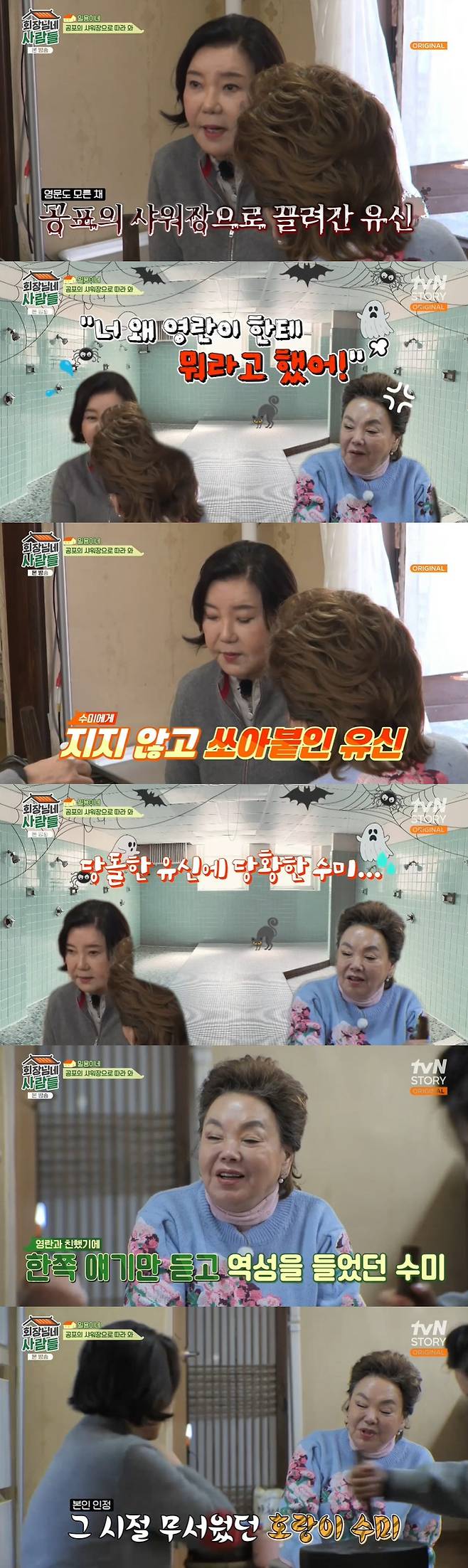 엄유신은 "언니하고 이 얘기하면서 풀어야겠다고 생각했다"고 말했고, 김수미는 "난 기억은 안 난다. 근데 영란이 하고 친해서 내가 역성들었던 거 같다. 그때 내가 사나웠다"고 미안해했다. 그러면서 "진짜 당한 사람은 못 잊는 거다. 난 생각도 안 난다"고 털어놨다.