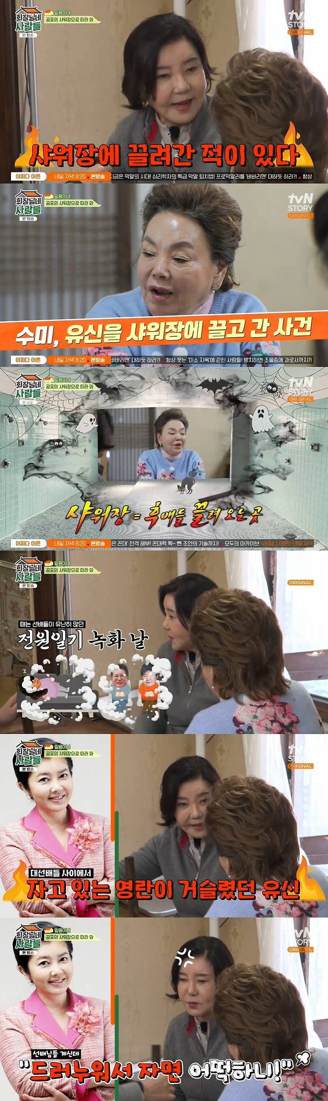김수미, 김혜정과 함께 맷돌을 갈던 엄유신은 "재밌는 얘기가 있다"며 입을 열었다. 이어 김수미를 향해 "언니가 불러서 처음으로 샤워장에 끌려간 적이 있다"고 말했다. 엄유신이 언급한 샤워장은 선배들이 후배들 군기 잡던 곳으로 명성이 자자해 배우들에게 '공포의 샤워장'으로 불렸던 곳이라고.