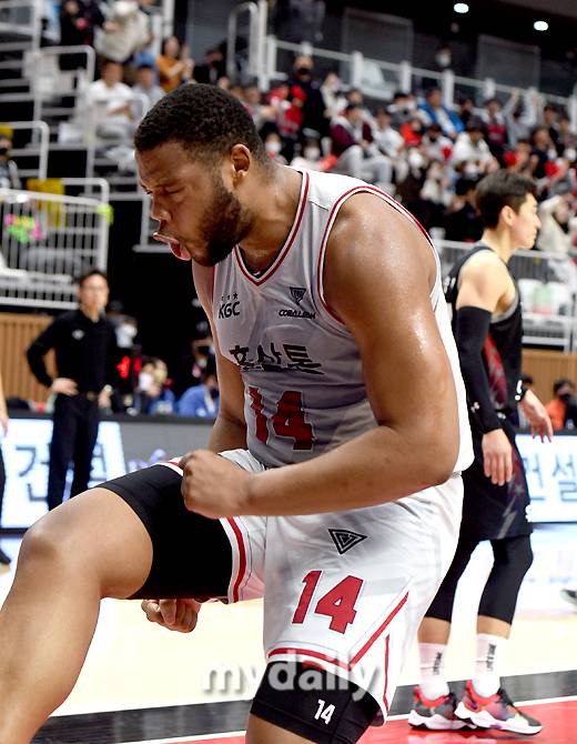 [마이데일리 = 수원 유진형 기자] 안양KGC 스펠맨이 6일 오후 경기도 수원 KT소닉붐아레나에서 진행된 '2022-2023 SKT 에이닷 프로농구' 수원KT와 안양KGC의 경기에서 포효하고 있다.