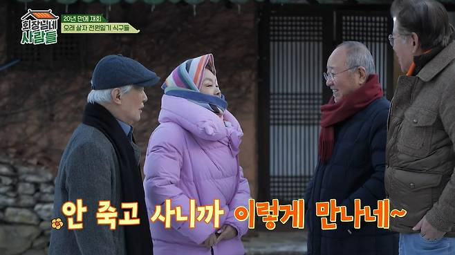 신충식, 정대홍이 방문하자 김수미는 따뜻한 포옹으로 맞이했다. 20년 만의 재회에 김수미는 "왜 이렇게 안 늙었냐. 우리가 안 죽고 사니까 이렇게 다 만난다"고 너스레를 떨었다.
