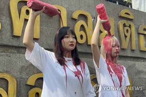 Political activists Orawan Phuphong, left, and Tatawan Tuatulanon, pour red liquid over their heads in protest outside the Criminal Court in Bangkok, Thailand, Monday, Jan. 16, 2023. Concerns about the condition of the two activists currently on hunger strikes seeking political and judicial reforms heightened Monday, Feb. 6, 2023, after the hospital where the two women are being kept urgently summoned their parents. (Ratsadon News via AP) JAN. 16, 2023, PHOTO, AP PROVIDES ACCESS TO THIS THIRD PARTY PHOTO SOLELY TO ILLUSTRATE NEWS REPORTING OR COMMENTARY ON FACTS DEPICTED IN IMAGE; MUST BE USED WITHIN 14 DAYS FROM TRANSMISSION; NO ARCHIVING; NO LICENSING; MANDATORY CREDIT