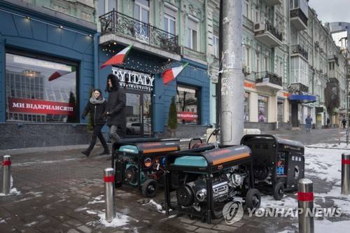 People pass by working generators during a power outage in Kyiv, Ukraine, Monday, Feb. 6, 2023. Russia has been bombing Ukrainian power grids for months, which caused rolling and emergency blackouts across the country. (AP Photo/Efrem Lukatsky)