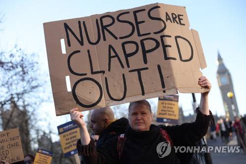 epa10450921 Striking nurses picket outside St Thomas's Hospital in London, Britain, 06 February 2023. Members of the Royal College of Nursing are joining ambulance workers in the GMB union in a walkout over pay, on what is expected to be one of the biggest strike days in the country's NHS (National Health Service) history. EPA/ISABEL INFANTES