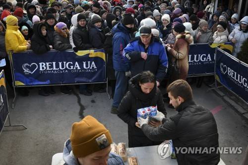 People receive bread and milk as a humanitarian aid at a distribution spot in Zaporizhzhya, Ukraine, Monday, Feb. 6, 2023. (AP Photo/Andriy Andriyenko)