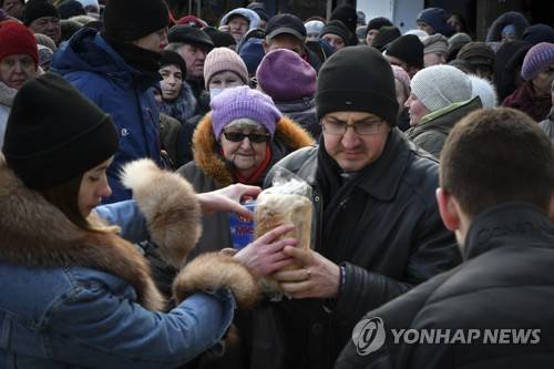 People receive bread at a humanitarian aid distribution spot in Zaporizhzhya, Ukraine, Monday, Feb. 6, 2023. (AP Photo/Andriy Andriyenko)