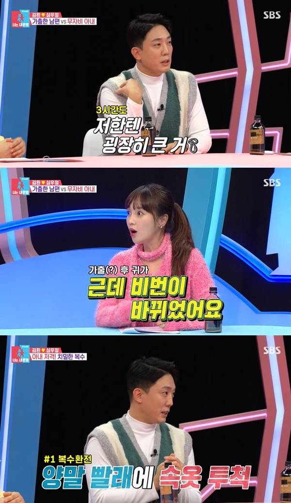 이어 김숙이 “매일 밤마다 치밀한 복수 계획을 세우고 있다고?”라고 묻자 김환은 “양말 빨래할 때 와이프 속옷을 넣는다든지. 그거 되게 통쾌하다. 와이프 잘 때 충전기를 빼놓는다. 오늘 차를 몰고 나가서 기름을 넣어야 하면 다음날 내가 차를 가지고 나가면 기름을 넣고 아내가 가지고 나가면 기름을 안 넣어둔다”고 답했다.