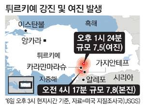 ![시리아와 국경을 맞댄 튀르키예 남동부에서 규모 7.8 강진이 발생한 6일(현지시간) 시리아 북서부 이들리브주 아즈마린 마을의 한 건물이 무너져 있다. 튀르키예와 시리아 당국은 이번 지진으로 인한 사망자가 각각 76명, 99명이라고 밝혔다. 지진으로 많은 건물이 붕괴해 사망자 수는 더 늘어날 것으로 보인다. 2023.02.06 [사진 = AP = 연합뉴스]](https://img3.daumcdn.net/thumb/R658x0.q70/?fname=https://t1.daumcdn.net/news/202302/06/mk/20230206235104390cbgp.jpg)