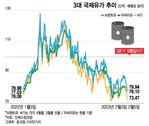 이날 현재 영국 런던ICE선물거래소에서 브렌트유 4월물 시세는 배럴당 79.94달러다. 러시아의 우크라이나 침공 이후 배럴당 120달러 이상으로 뛰었던 브렌트유 시세는 지난해 9월부터 꺾이기 시작해 최근 두 달여간 70~80달러대를 오가고 있다. 뉴욕상업거래소(NYMEX)에서 3월 인도분 서부텍사스산중질유(WTI) 시세는 배럴당 73.47달러, 두바이유 현물의 경우 78.1달러 선으로 비슷하다. 골드만삭스 전망대로라면 올 하반기 국제유가가 현 시세 대비 25% 안팎 오른다는 것이다.