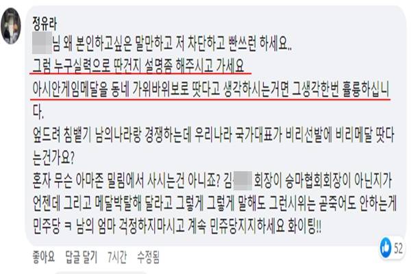 정씨는 한 이용자가 자신을 비판하는 댓글을 남기자 “아시안게임 메달을 동네 가위바위보로 땄다고 생각하시는 거면 그 생각 한번 훌륭하시다”며 “그럼 누구 실력으로 (메달을) 딴 것인지 설명해보라”고 물었다. 정씨는 이어 “나의 엄마 걱정하지 마시고 계속 민주당 지지하라”고 덧붙였다.