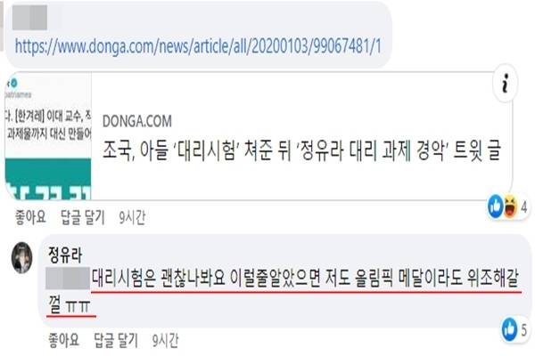 이 같은 게시글을 공개한 뒤 정씨는 댓글을 통해서도 계속해서 자신의 입장을 밝히고 있다. 특히 정씨는 조씨와 자신에게 적용된 ‘잣대’가 다르다고 지적하고 있는 것으로 보인다. 정씨는 조 전 장관이 아들의 대리 시험을 쳐줬다는 기사 링크에 대해 “대리 시험은 괜찮나 봐요. 이럴 줄 알았으면 저도 올림픽 메달 위조해갈걸”이라고 남겼다.