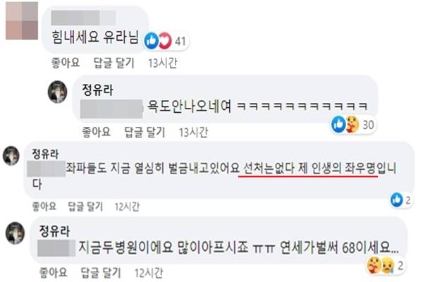 또 다른 댓글에서는 “좌파들도 지금 열심히 벌금 내고 있다”며 “선처는 없다, 제 인생의 좌우명”이라고 강조하기도 했다. 정씨는 지난해에도 자신을 향한 악성 댓글들을 무더기로 경찰에 고소한 바 있다.