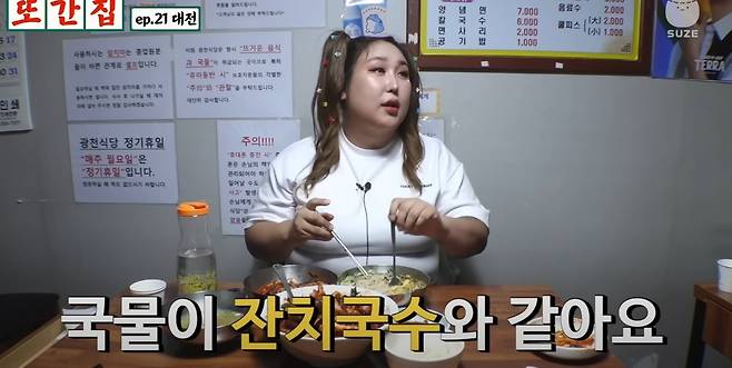 또 칼국수까지 맛본 풍자는 "잔치국수 같은 정겨움. 유브, 계란, 호박무침까지 올라갔다"라며 "국물이 잔치국수와 같다. 김가루맛, 계란 지단에서 나오는 국물 멸치육수 맛이 확 나는데 면이 잔치국수와 칼국수와 우동의 그 어딘가다. 이거 하나만 먹으러 와도 되겠다"라고 말했다.