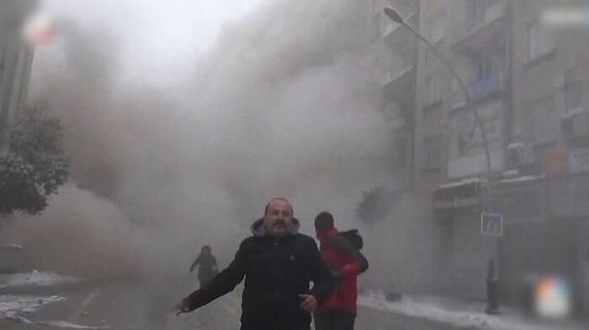 [튀르키예 방송국 기자 : 제 왼쪽으로 보이는 건물이 무너져 내렸습니다. 도로가 먼지로 가득찼습니다.]