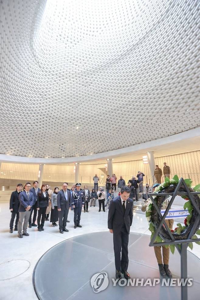 (서울=연합뉴스) 박민식 국가보훈처장이 6일(현지시간) 예루살렘에 위치한 현충기념관을 방문해 헌화하고 있다. 2023.2.7 [국가보훈처 제공. 재판매 및 DB 금지]