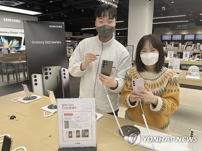 (서울=연합뉴스) 전자랜드가 7일부터 오는 13일까지 삼성전자 '갤럭시 S23 시리즈'의 사전 예약 프로모션을 한다고 밝혔다. 사진은 자랜드 타이푼에서 고객들이 갤럭시 S23 시리즈를 살펴보는 모습. 2023.2.7 [전자랜드 제공. 재판매 및 DB 금지]