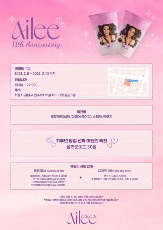 서울 강남구에 위치한 코드로 파라다이스에서 진행되는 이번 행사는 이벤트 기간 해당 매장에 방문해 에일리 세트를 구매하면 음식과 함께 특전품을 제공한다. 또한 데뷔 11주년 당일인 9일에는 선착순으로 폴라로이드를 제공하는 특전이 주어진다.