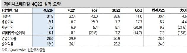 제이시스메디칼의 2022년 4분기 연결 재무제표 기준 매출은 318억원으로 전년 동기 대비 42% 늘었다. 영업이익은 91억원으로 35.9% 증가했다. 컨센서스 대비로는 각각 4.6%와 4.4%를 웃도는 수치다.