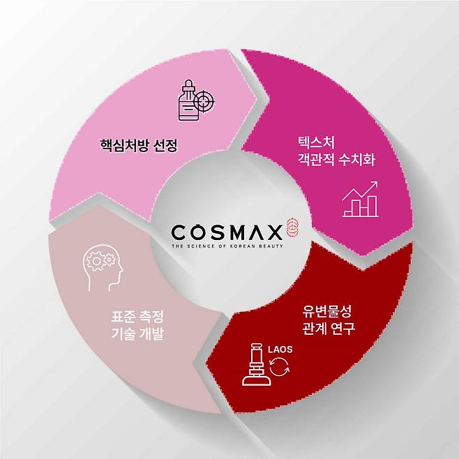 코스맥스가 개발한 텍스처 표준 측정 기술은 화장품의 사용감을 구체적이고 정량화된 수치로 나타낸다. 사람의 개입 없이 텍스처의 수준 측정이 가능해 제품 개발 속도를 단축하고 품질 검증 속도를 높일 수 있다. 원하는 대로 사용감을 정밀하게 조정해 맞춤형 화장품 개발 등에 폭넓게 적용이 가능하다.