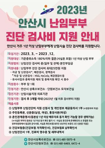 안산시(시장 이민근)는 아이를 원하는 난임 부부의 경제적 부담을 완화하고 건강한 출산을 지원하기 위해 난임 진단 검사비 지원사업을 추진한다고 7일 밝혔다.