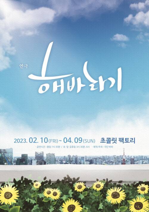 연극 ‘해바라기’는 2월 10일부터 부산 대연동에 위치한 초콜릿 팩토리에서 공연을 진행한다. 자세한 공연 문의 및 티켓 예매는 포털 검색과 온라인 예매처에서 확인 가능하다.