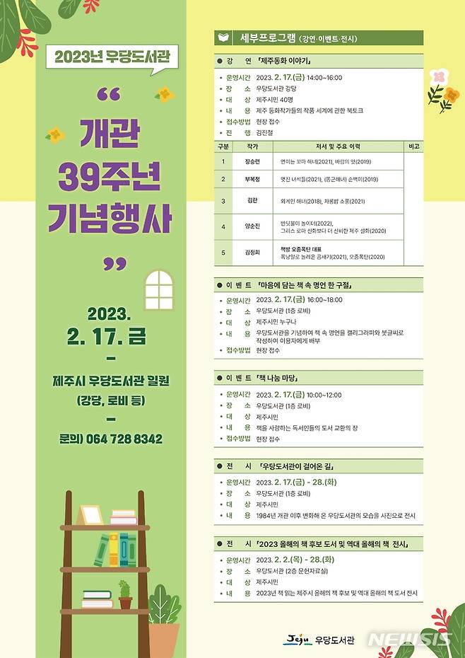 [제주=뉴시스] 우장호 기자 = 제주시 우당도서관(관장 강봉수)은 오는 17일, 개관 39주년 기념 행사를 개최한다고 7일 밝혔다.